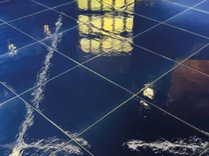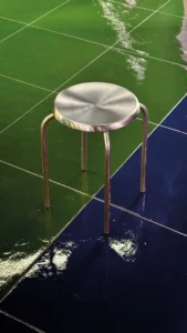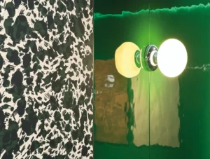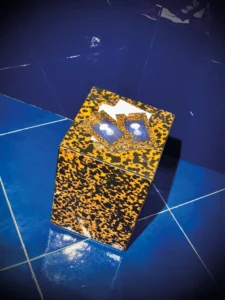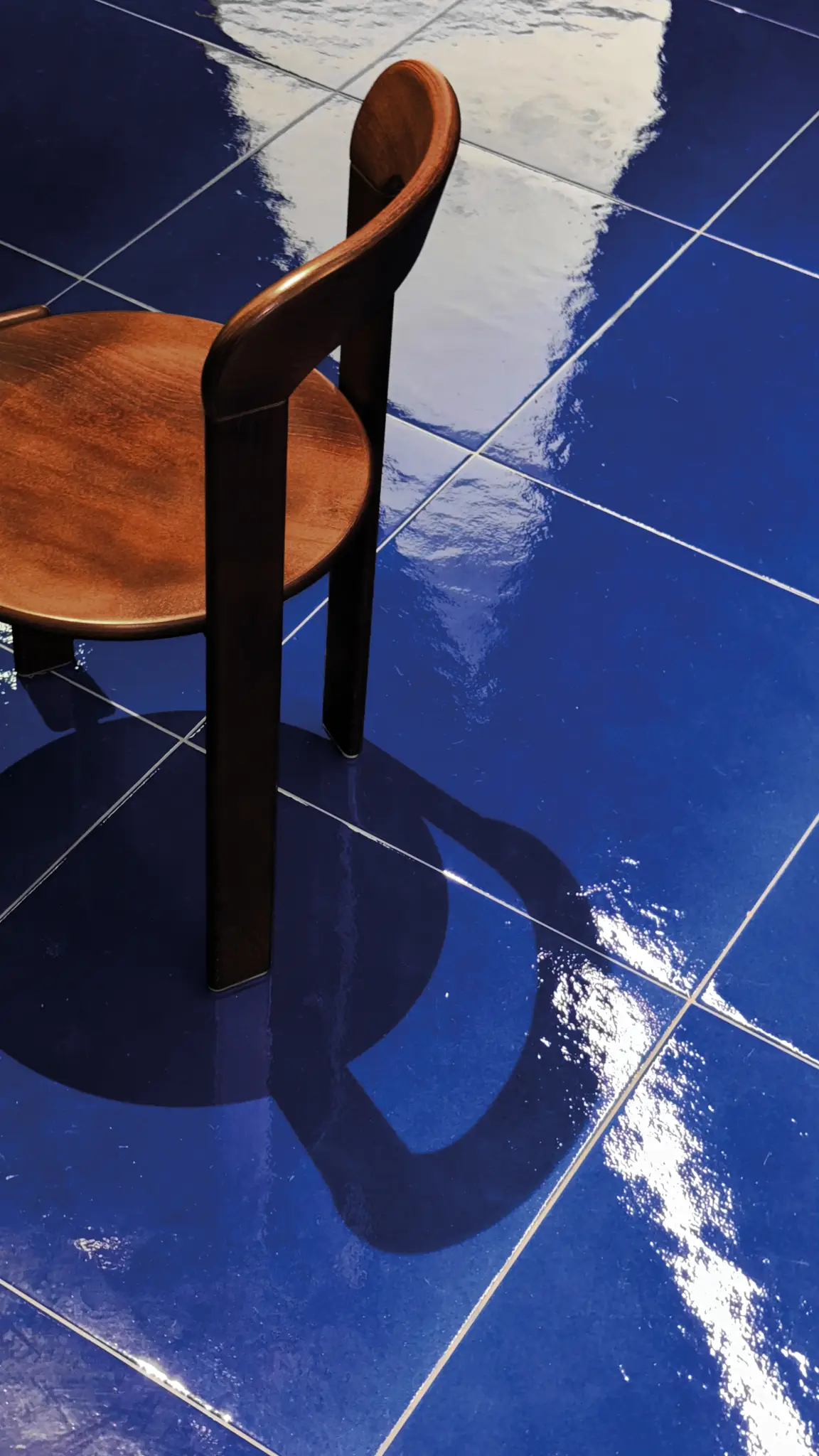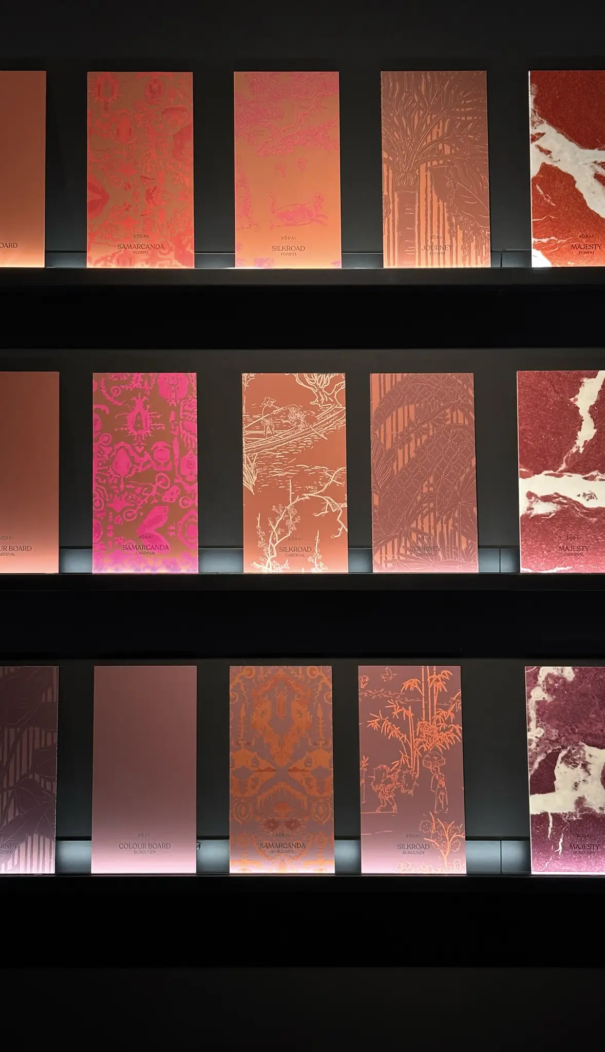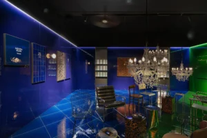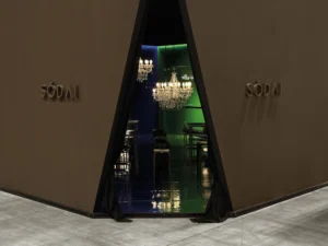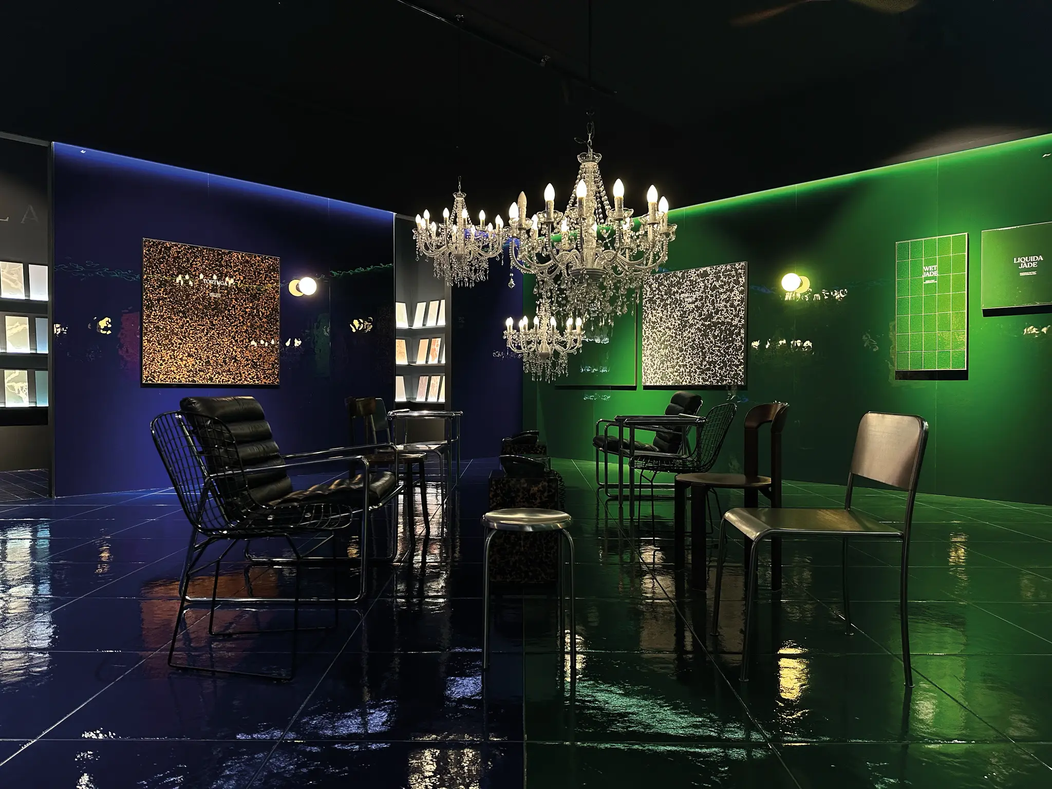 L’accesso, una sottile fenditura, introduce a uno spazio liquido e astratto, fatto di riflessi, luci soffuse e contrasti cromatici.